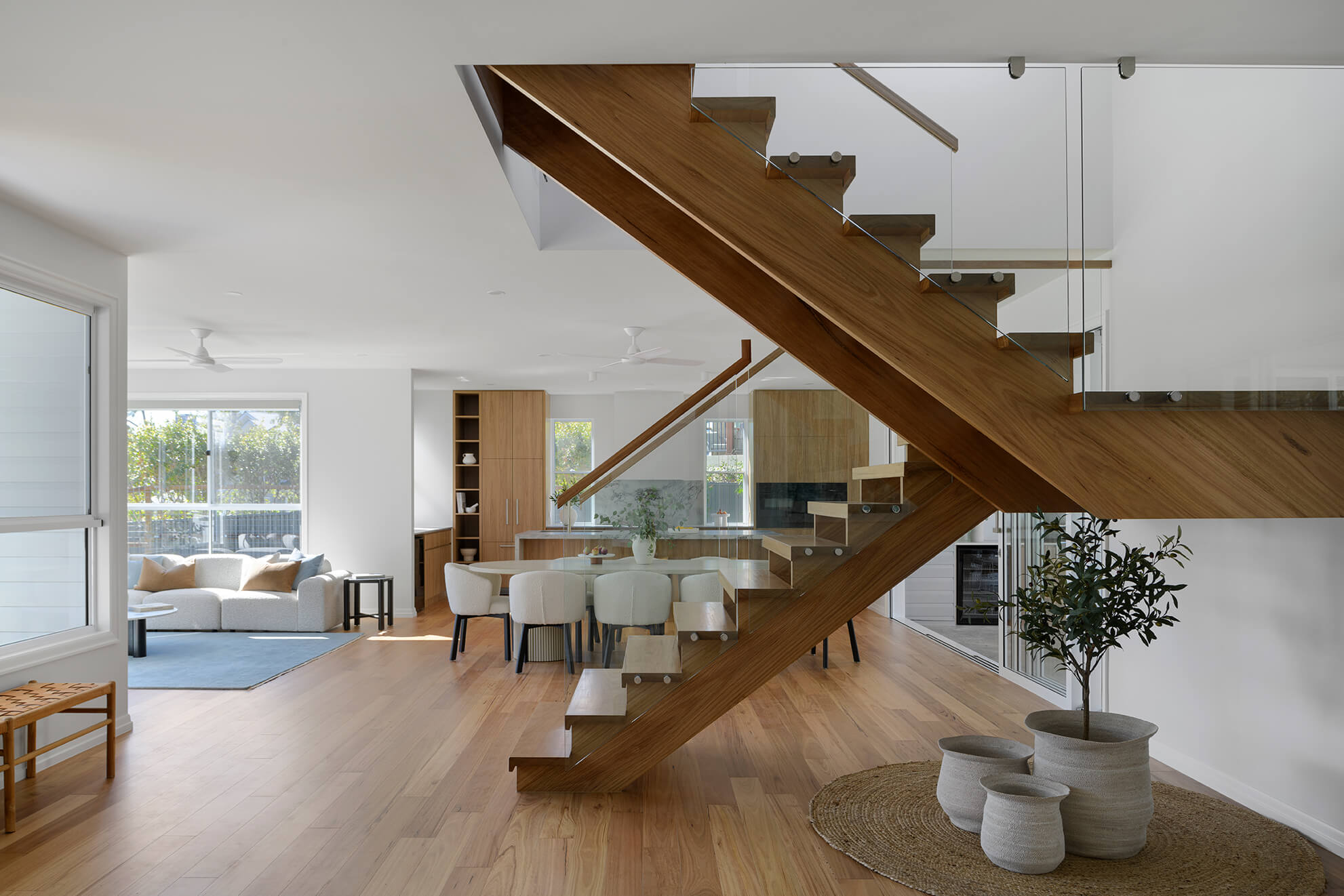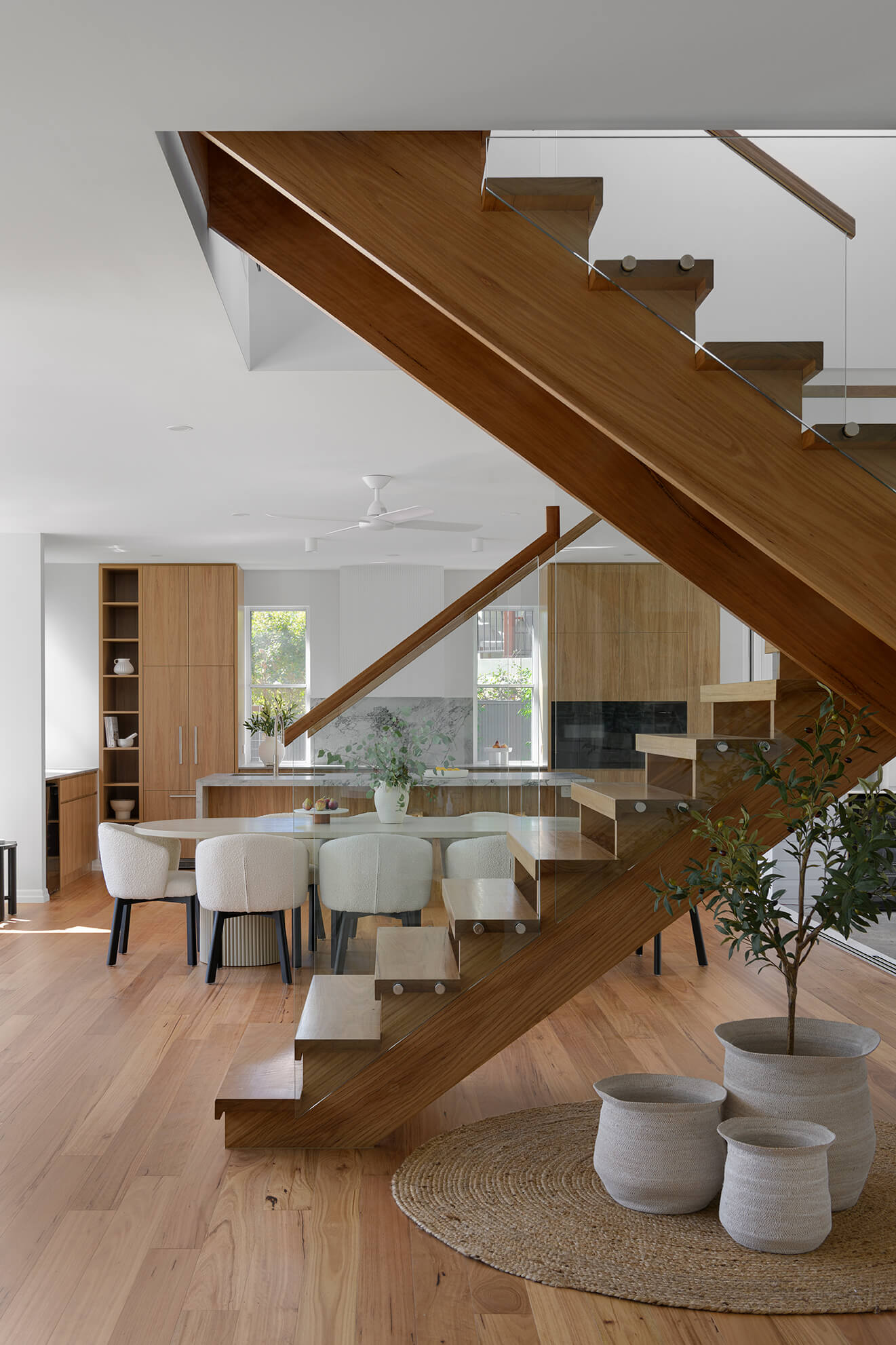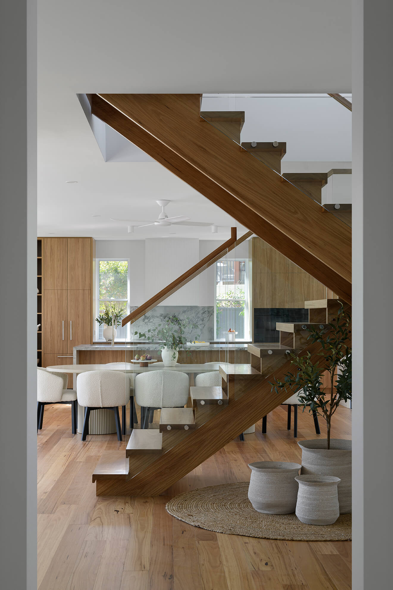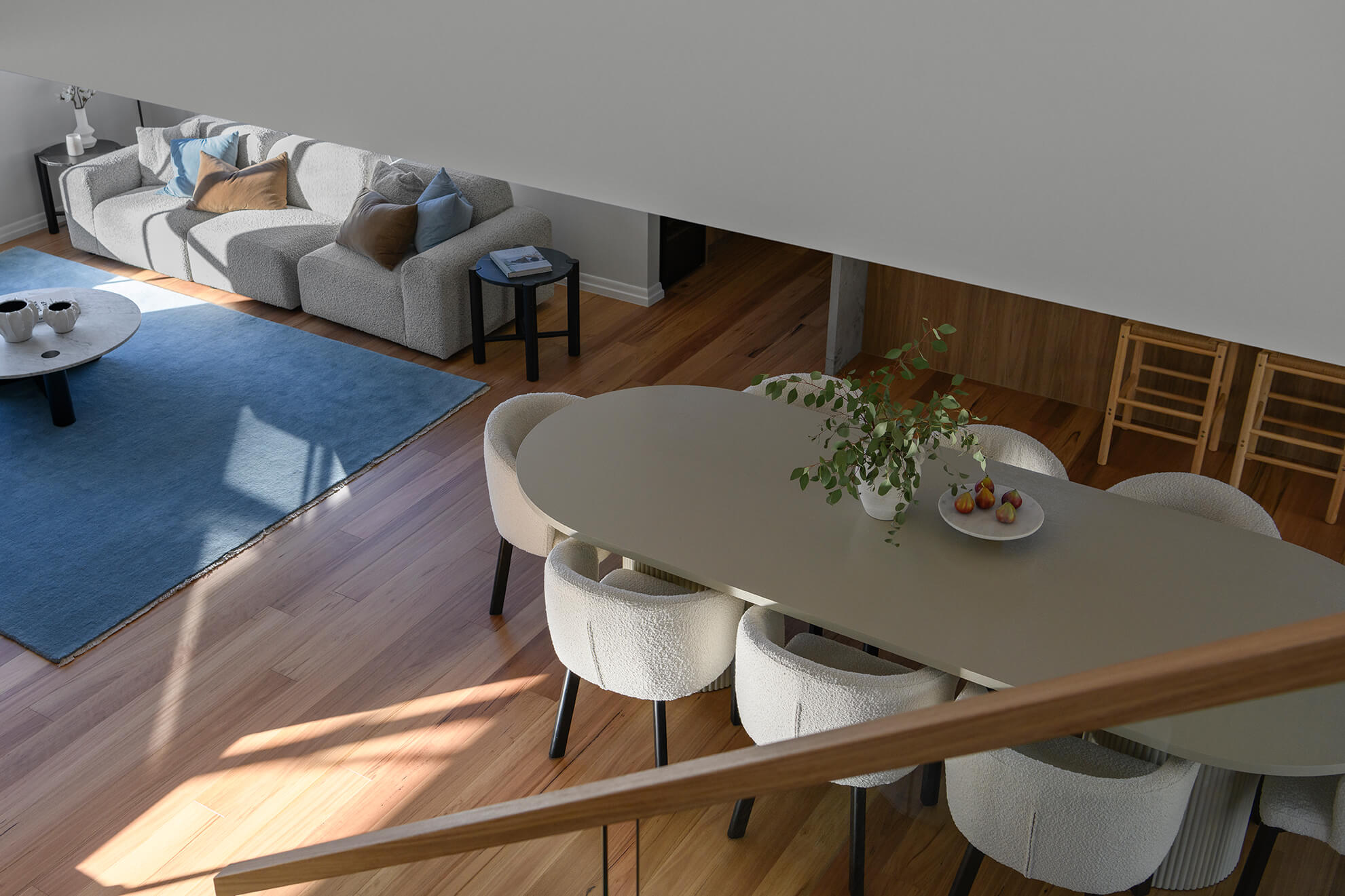 A carefully layered selection of timber tones, natural stone and soft finishes reinforces the home’s warmth and longevity, while the new extension provides scale and flexibility suited to evolving family life.